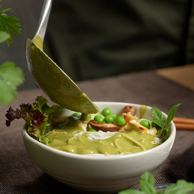 Frisch, aromatisch und angenehm scharf – die grüne Currypaste gehört zu den bekanntesten Würzbasen der thailändischen Küche. Zitronengras, Kaffir-Limettenblätter, Koriander und Ingwer sorgen für intensive Frische, während Chili, Kurkuma und Kreuzkümmel die nötige Schärfe und Würze beisteuern. In Kombination mit Nori-Algen und Cashewkernen entsteht ein rundes, vielschichtiges Aroma, das sich ideal für Wokgerichte, Currys, Nudel- und Reisrezepturen eignet. Sie können von der Paste gleich etwas mehr zubereiten und einen Teil dann auf Vorrat einfrieren.