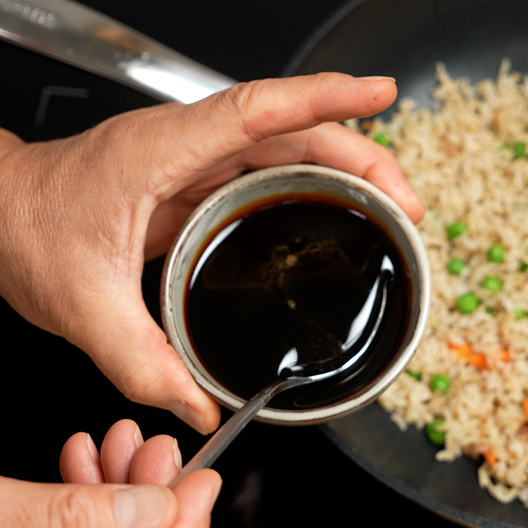Traditionell wird die Teriyaki-Sauce in japanischen Haushalten aus Sojasauce, Mirin (süßer Reiswein zum Würzen), Sake (trockener Reiswein) und Zucker im Verhältnis 1:1:1:1 immer frisch hergestellt. Sie wird zum Glasieren von in Sesamöl gebratenem Fisch, Fleisch und Hühnchen verwendet. Unsere Variante wird aus Tamari, Reisessig, Yaconsirup, Sesamöl und Ingwer zubereitet und mit etwas Stärke gebunden. Sie bringt den typischen Geschmack an Gemüse-, Pilz- oder Tofugerichte, eignet sich aber nicht zum Glasieren, da ihr der Zucker für die karamellisierende Wirkung fehlt.