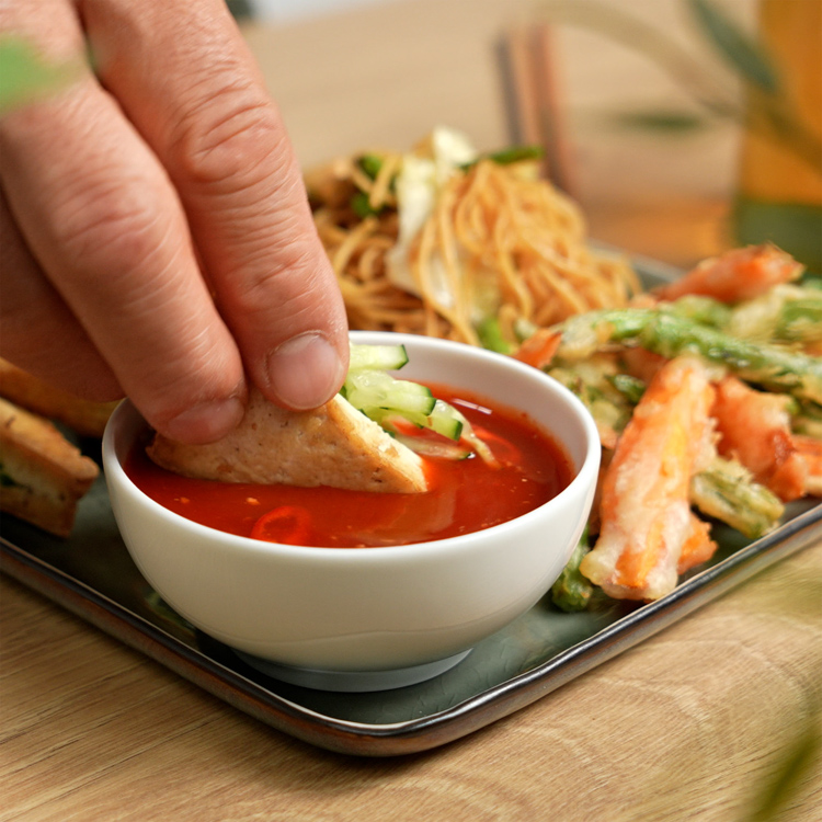 Süß, leicht scharf und gleichzeitig fruchtig – die Sweet-Chili-Sauce ist eine der beliebtesten Würzsaucen Südostasiens. In unserer Variante werden frische Chilischoten mit Reisessig, Tamari und Agavendicksaft püriert und mit etwas Stärke gebunden. So entsteht eine aromatische Sauce ohne künstliche Zusätze. Die Sauce passt wunderbar zu den unterschiedlichsten Gerichten – von gebratenem Tofu und Tempeh über Sommerrollen bis hin zu gebackenen Kartoffeln, Pommes oder frischem Gemüse.