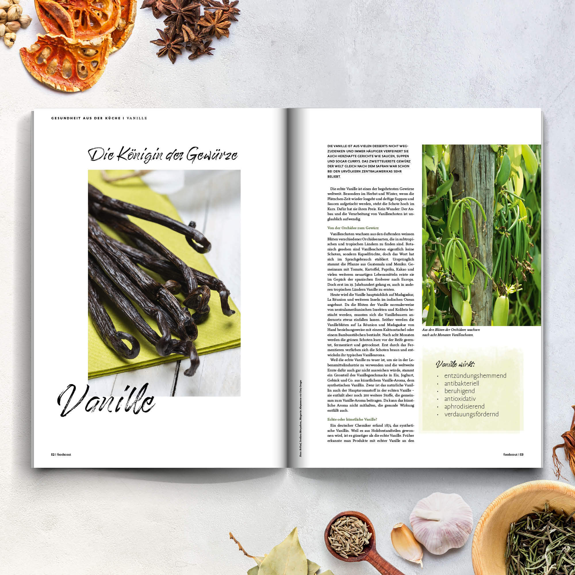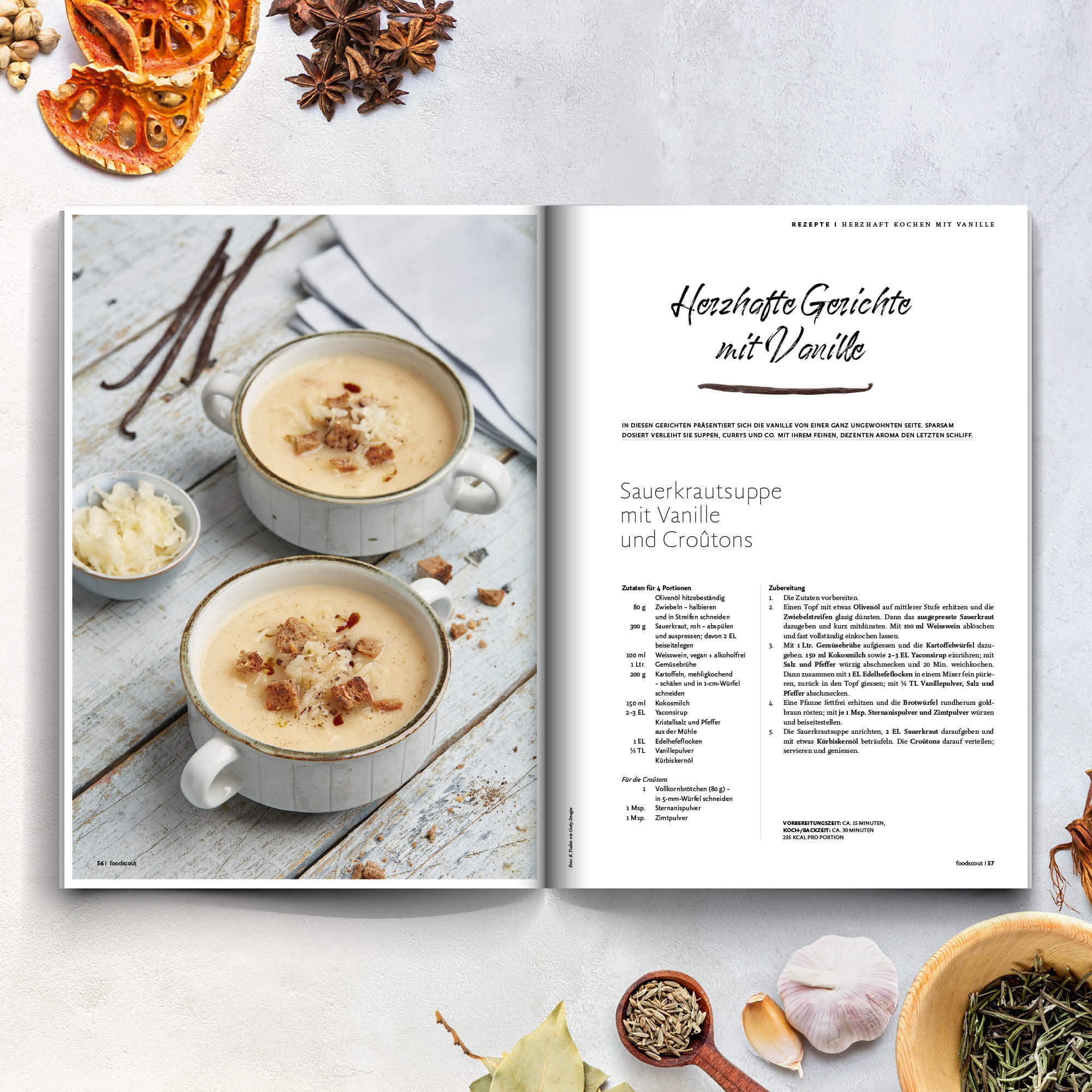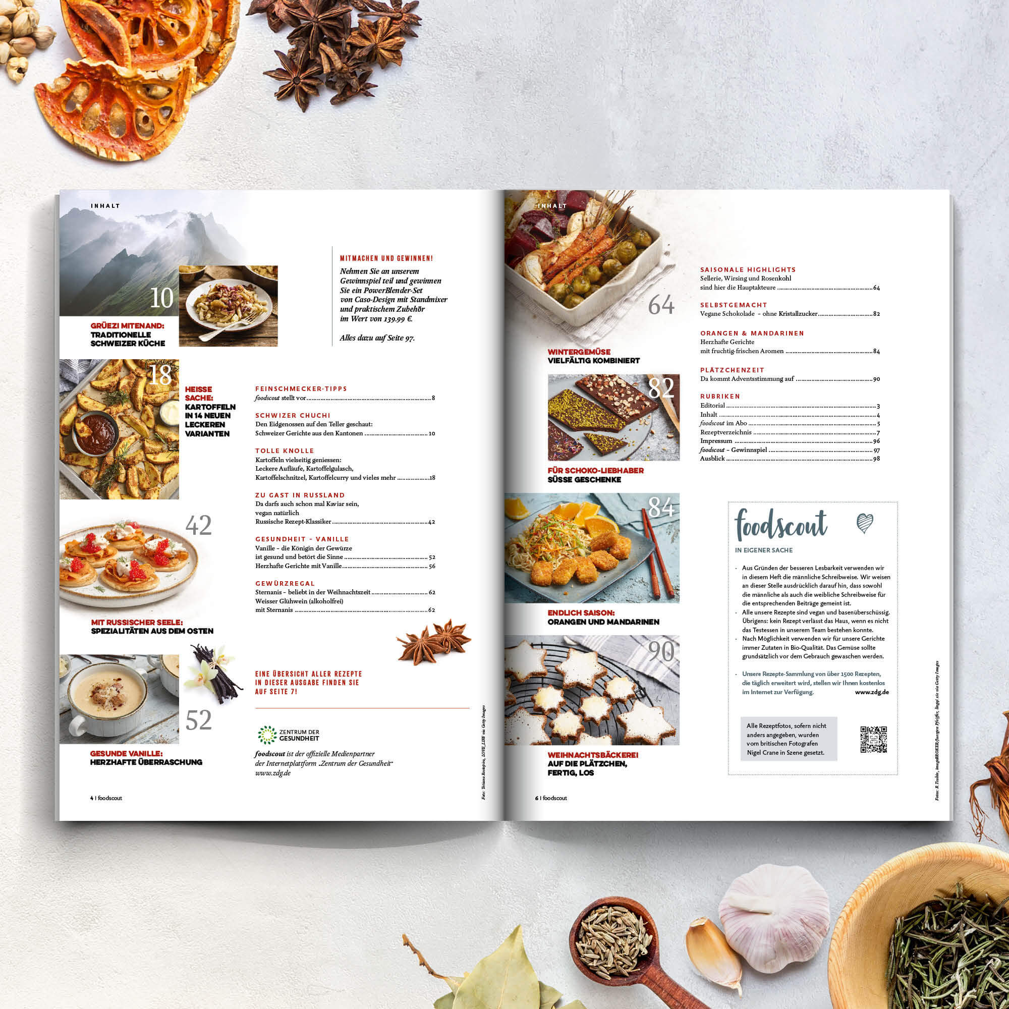 Nebenbei erfahren Sie in foodscout viel Wissenswertes über zwei ganz besondere Gewürze, die Vanille und den Sternanis – jeweils mit Rezepten, die Körper und Seele wärmen. Besonders wichtig – zumindest für die Seele – ist ausserdem die Schokolade. Während die käuflichen Sorten viel Zucker und meist auch viel Milch enthalten, ist eine selbstgemachte Schokolade nicht nur ein köstlicher Traum für süsse (und vegane) Geniesser, sondern auch noch enorm gesund. Probieren Sie daher schnell das Schokoladenrezept in foodscout ab S. 82!Das Foodscout ist ein digitales Produkt und ausschliesslich als E-Book erhältlich.