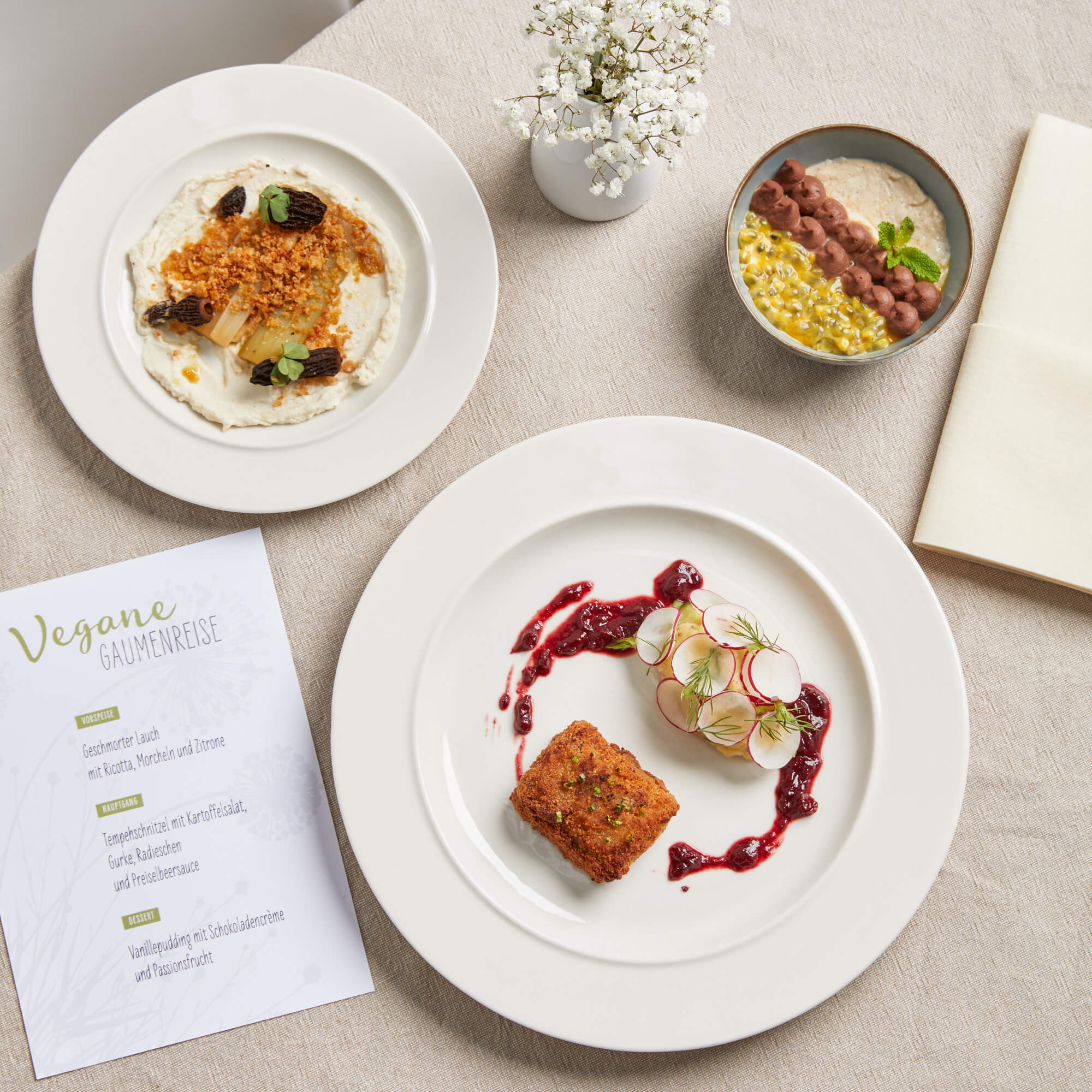 Das Menü Vegane Gaumenreise ist etwas aufwändiger. Rechne mit einer 2-stündigen Vorbereitungszeit. Auch hier erhältst du die drei Gänge noch einmal in einzelnen Videos, denn ob Vorspeise, Hauptgericht oder Dessert – alle Gerichte passen natürlich auch zu anderen Gelegenheiten und müssen nicht als komplettes Menü zubereitet werden.