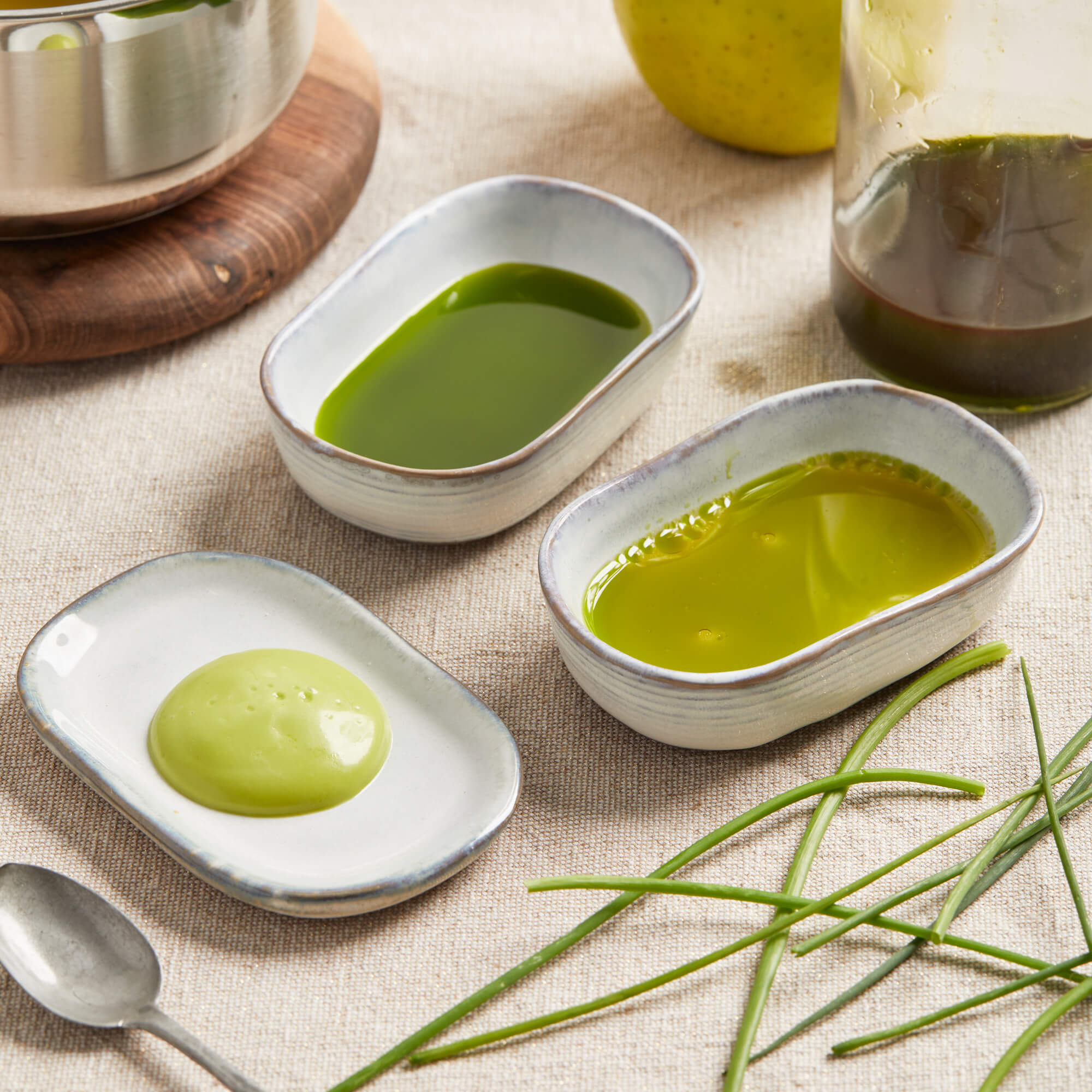 In diesen beiden Lektionen stellst du insgesamt vier Zutaten her, die du für das Menü de luxe benötigst, die aber auch zu vielen anderen Gelegenheiten eingesetzt werden können: Ein aromatisches Kräuteröl, eine sahnige Kräutercrème, ein schneller selbstgemachter Apfelsaft und knusprige Mandelhippen.